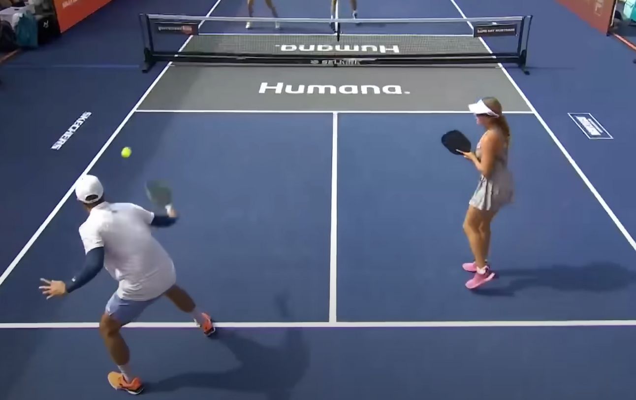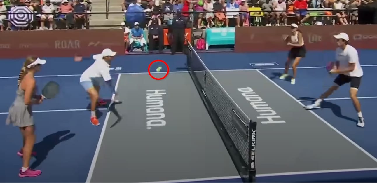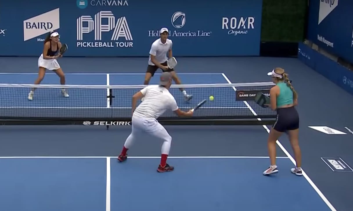Poaching in dinking rallies happens often in doubles. It’s usually done by the player whose forehand is in the middle; however, there are times when a player on the right side of the court can poach a ball with their backhand.
