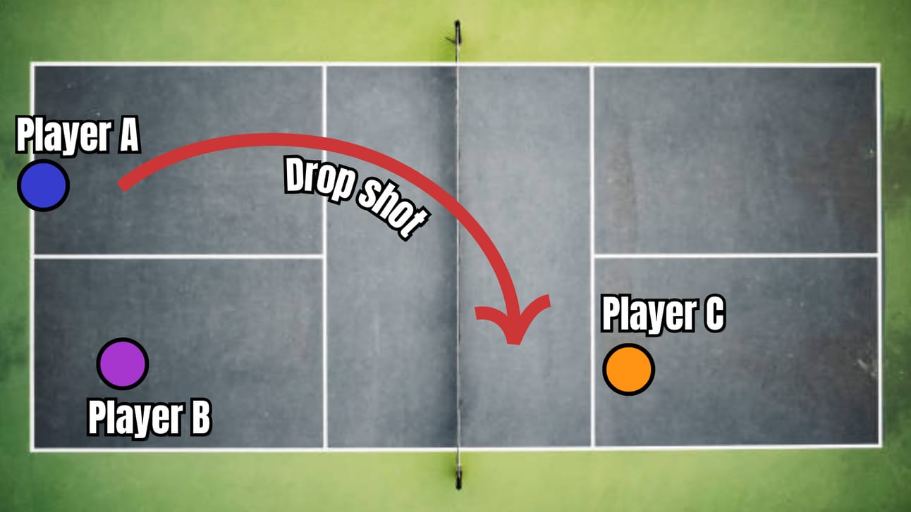 The player at the baseline who is not hitting the drop begins to creep into the court, watching their partner’s shot, and either moves up to the kitchen and poaches the shot or stays back at the baseline. In response to the drops, Player C should mix up their shots by sending them to different parts of the court. Their goal is to try to prevent any poaches.