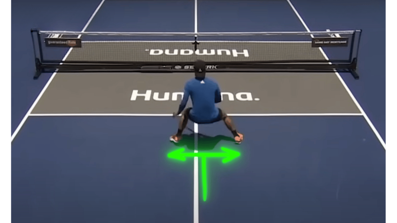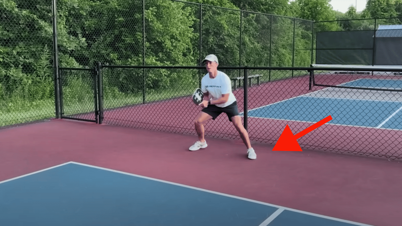 This footwork is crucial when transitioning to the kitchen line. Be aware of when your opponent is about to hit the ball and avoid moving forward in the court at that moment. When you’re moving towards the kitchen line and see your opponent about to make their shot, take one final step to stop your momentum, then plant both feet simultaneously in a lateral position. If you split step like this, you are balanced and ready to react to any shot your opponent sends your way.