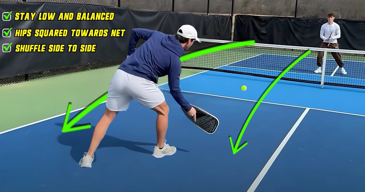 This drill only needs two players and is all about staying low, keeping a wide stance, and building confidence in your footwork without the pressure of unpredictable shots. With your drilling partner, you can position yourselves straight across from each other or diagonally—or do both! This drill can be applied to dinks, drops, resets, or drives, so whichever shot you choose to work on will determine where one player is positioned in the court. The other player will be at the net.